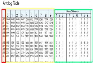 · Consider 1st two digits of the mantissa and look them in the first block that is pointed with red color. Observe the 3rd digit of the mantissa in the second block which is pointed with yellow color and the 4th digit of the mantissa will be looked in the 3rd mean difference block which is pointed out with green color.